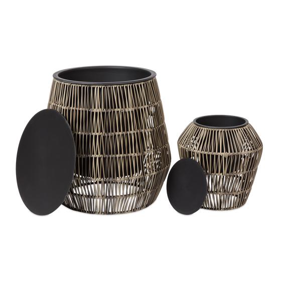 Bring atmosphere to your interior or garden with this set of two rattan-look plant pots. Thanks to the clever design with a lid, you can use them not only as plant pots but also as side tables. Great for plants and for decoration!