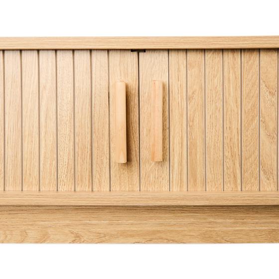 This minimalist sideboard is a perfect match for the trendy Japandi style. With its slim design and vertical slats, it makes a stylish addition to any room. Place it in the hallway with a mirror on top or use it as a side table in the living room, decorated with your favourite vase, books or photo frames. Thanks to its narrow shape, it fits just about anywhere.
