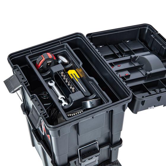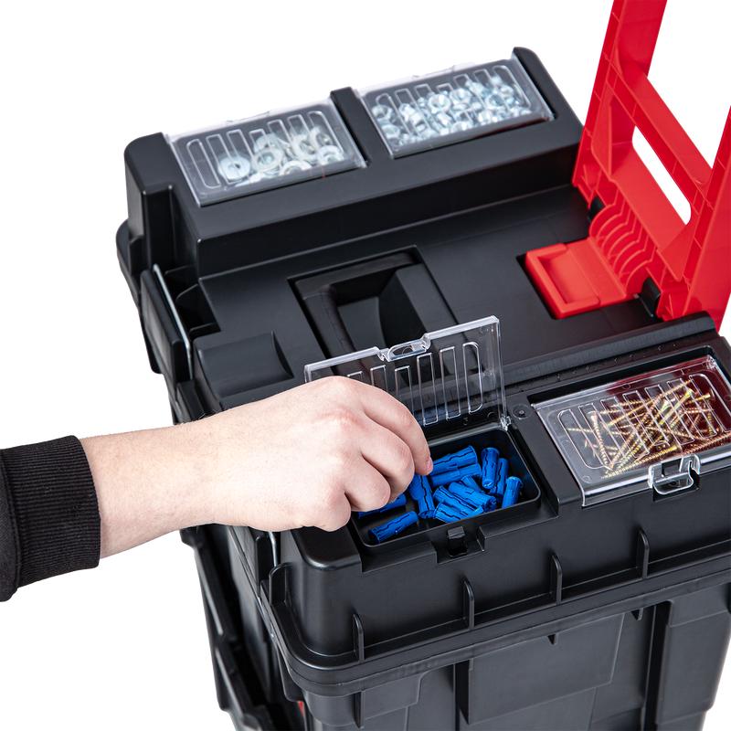 Sur le dessus, vous trouverez 4 compartiments parfaits pour vis, chevilles et autres petites pièces. Les couvercles transparents vous permettent de voir d’un coup d’œil ce qu’ils contiennent. À l’intérieur, deux grands compartiments offrent ensemble pas moins de 68 litres d’espace de rangement. De quoi tout emporter sans rien oublier !