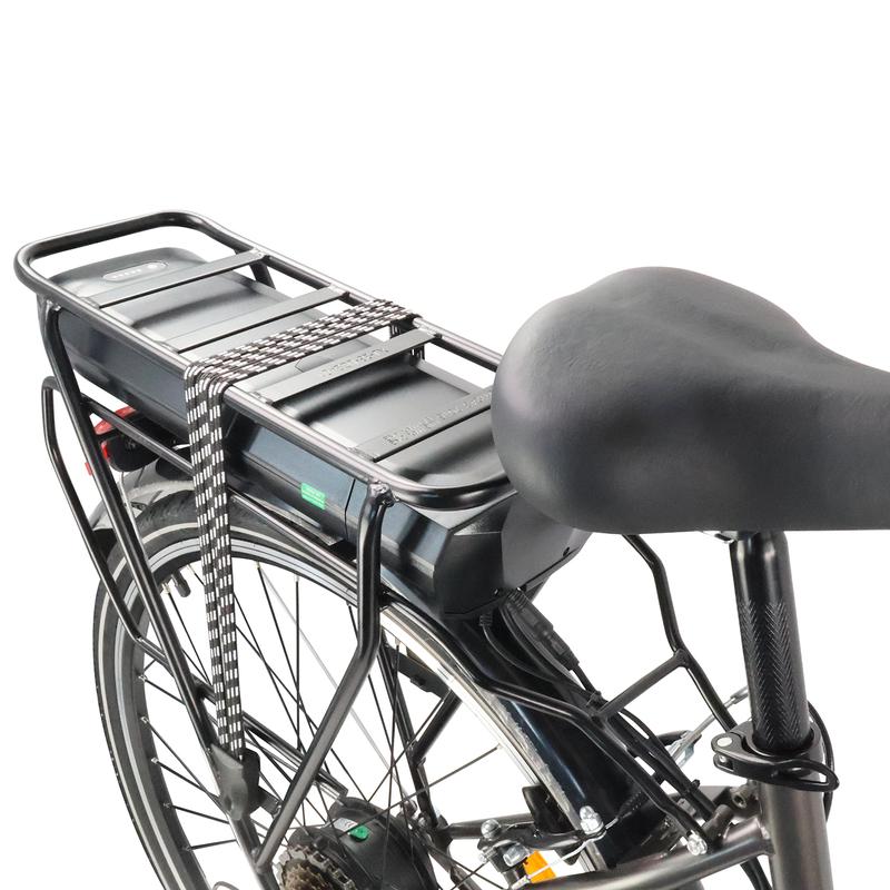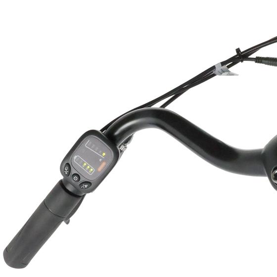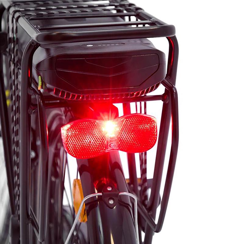 La batterie de 13 Ah, fixée sur le porte-bagage, est amovible pour un rechargement simple. Grâce à la commande rotative sur le guidon, vous passez sans effort entre les 6 vitesses. L’écran LED vous permet de visualiser les 5 niveaux d’assistance et l’état de la batterie. Une fonction d’assistance à la marche est également intégrée : idéale dans les montées, sur les ponts ou quand vous poussez le vélo chargé.