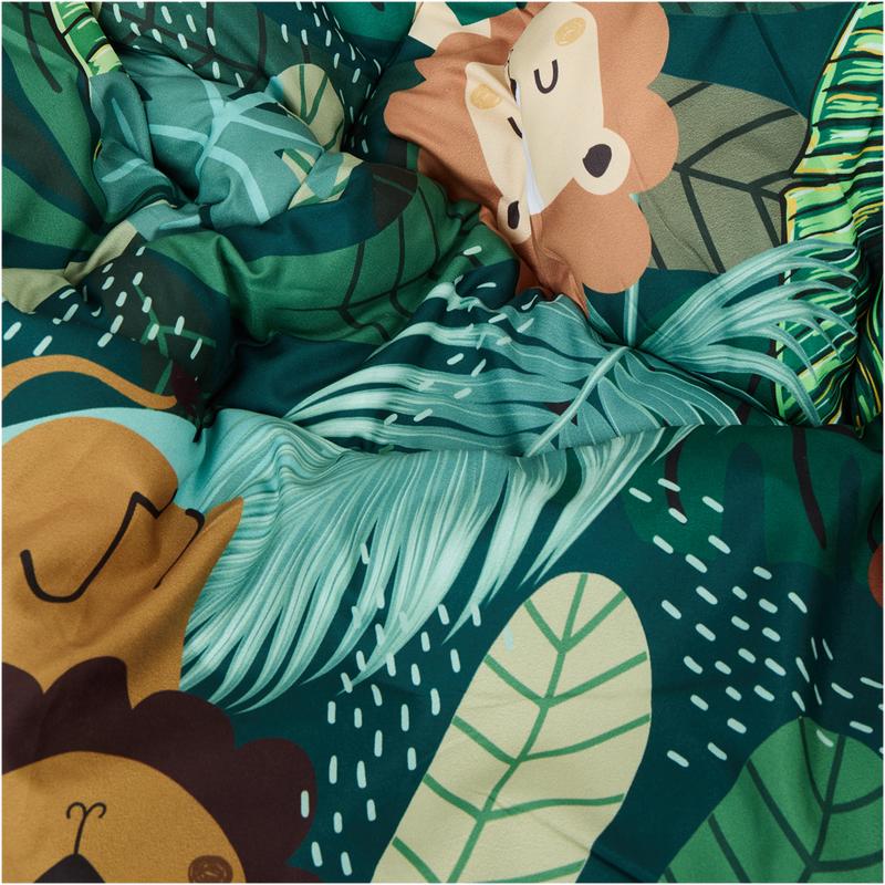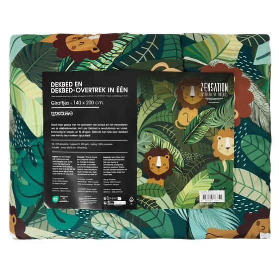 Het opmaken en verschonen van kinderbedden wordt een eitje, dankzij dit Lazy dekbed en dekbedovertrek in één. Je stopt het dekbed namelijk met hoes en al in de wasmachine en de droger. Dat scheelt je lekker veel tijd. Daarnaast past de toffe groene jungleprint perfect in kinderkamers.