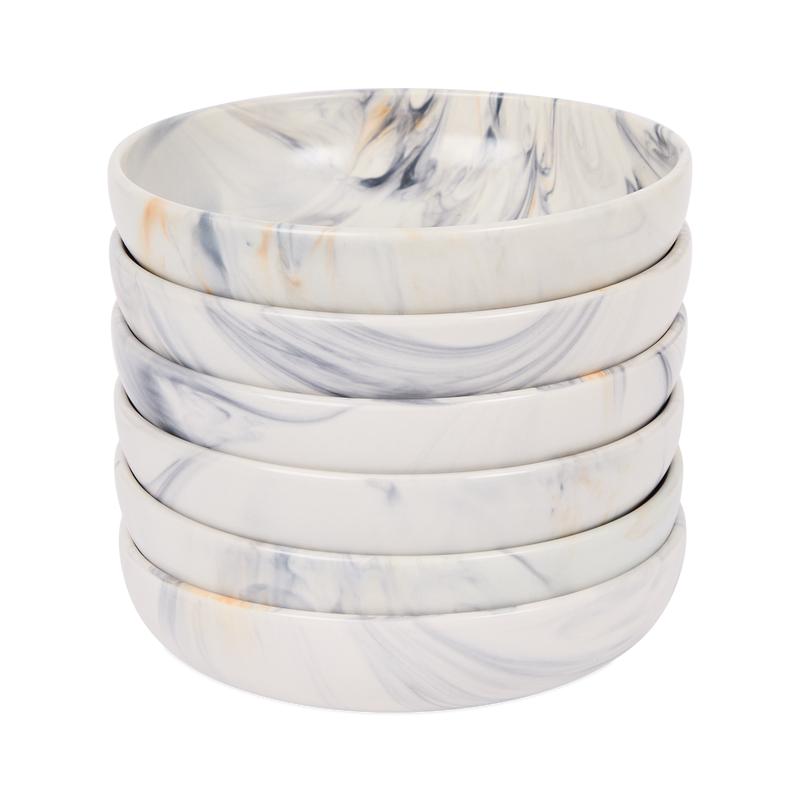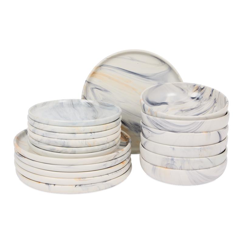 De prachtige set is geschikt voor zes personen en bestaat uit diepe borden, ontbijtborden en dinerborden. Je kunt ’m dus gebruiken voor ontbijt, lunch en diner. De borden zijn gemaakt van stevig en slijtvast steengoed en hebben een superstijlvolle marmerlook. Leuk detail: ieder bord is uniek!